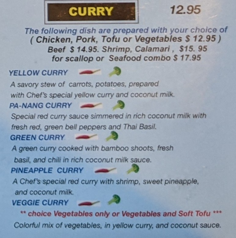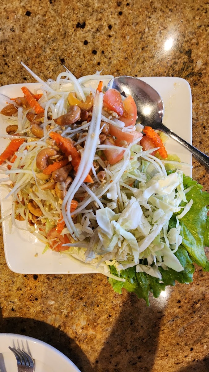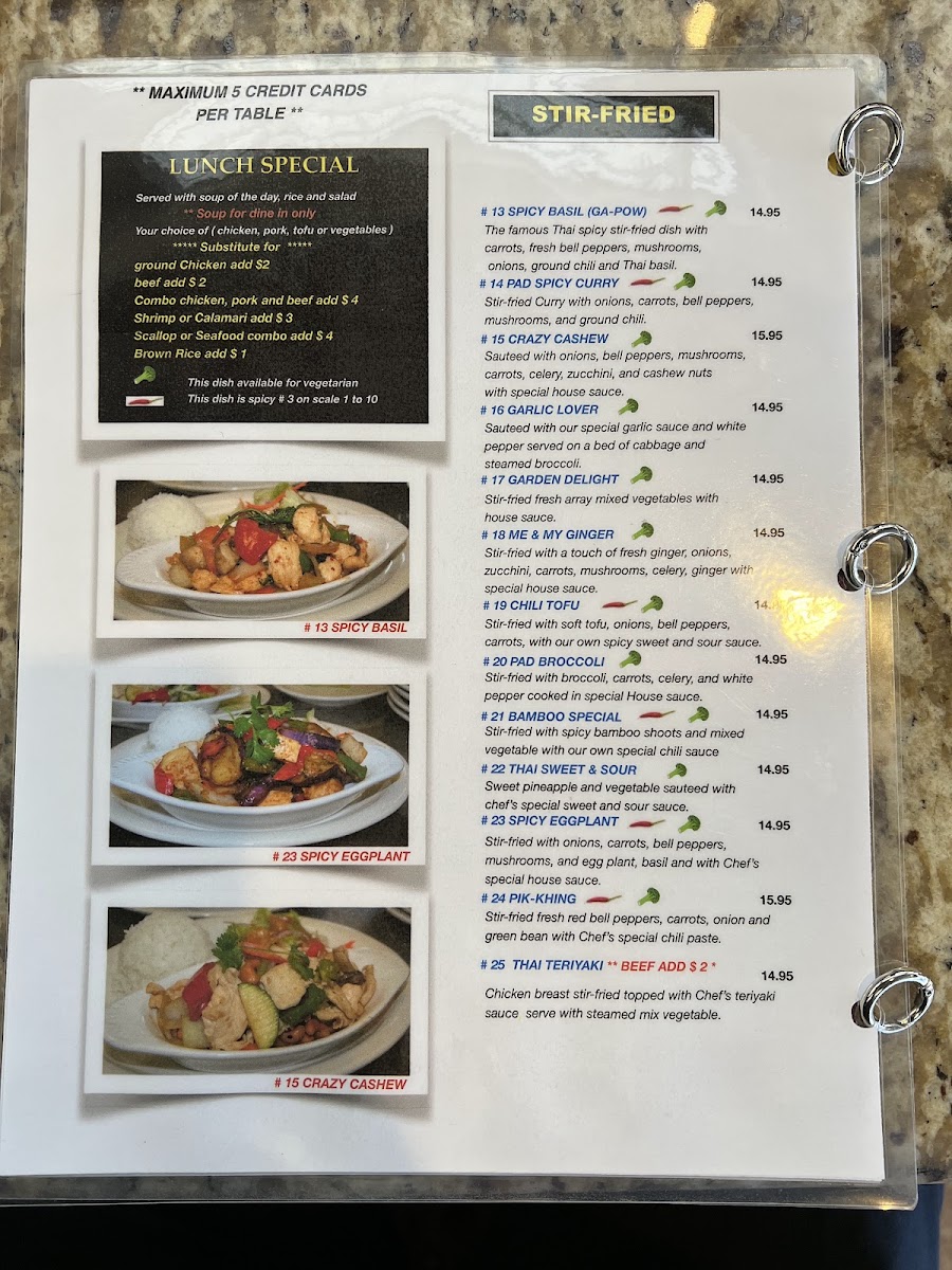 As you delve deeper into the menu, the salads provide a fresh and zesty interlude to your meal. The Shrimp Lime Salad, featuring grilled shrimp tossed with vibrant vegetables and a special house lime sauce, is a refreshing choice that excites the palate. If you're a curry enthusiast, the Spicy Pad Curry and Panang Curry are must-tries, celebrated by patrons for their bold flavors and generous portions.